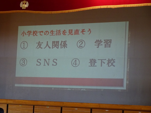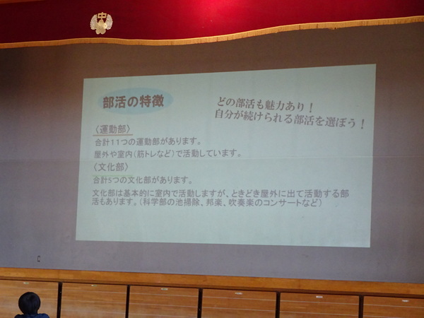 次に、生徒会役員の生徒さんに中学校生活の説明をしていただきました。日課や学習、部活動などについて、自分たちの体験を交えた話をしていただきました。