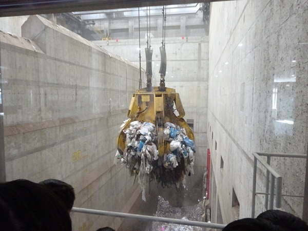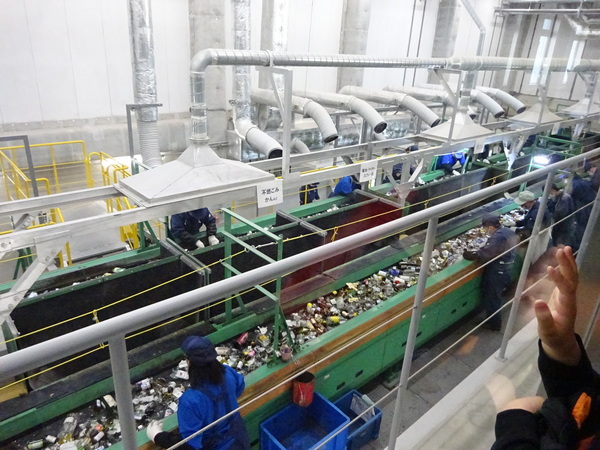 まず、見沼環境センター(見沼区)に行きました。こちらは令和7年4月1日(火)に供用が開始された、とても新しい施設でした。最先端のゴミ処理方法や発電方法について、学ぶことができました。朝のごみ収集を終えたごみ収集車が次々に訪れる様子やプラットフォームからごみピットにごみが落とされる様子、ごみクレーンで焼却炉にごみを入れる様子などを間近に見ることができました。また手作業でびんや缶を選別する様子も見ることができました。ごみの分別の大切さや減量化について考える見学となりました。