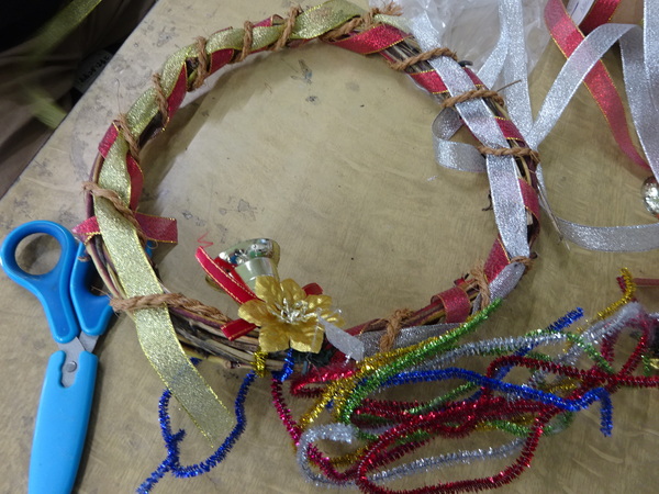 友達と作品を見せながら飾り付けを進めたり、一度付けた飾りを外して別な箇所に付け直したり、リボンをねじって巻き付けたりして仕上げていきました。写真の作品の中には制作途中のものもあります。
