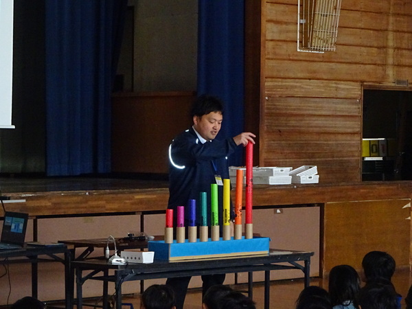今回は、「音を出して調べよう」というテーマで、目の前での実験を通して、音について考えを深められる内容でした。音叉を使って音の伝わり方を学ぶ実験、音で火を消す実験、骨伝導を学ぶ実験、真空の中で音が伝わるかを確かめる実験など様々な実験がありました。児童は、どの実験にも興味津々。実験の様子をよく見る児童ばかりで、目の前で起こった現象に大きな歓声を上げていました。